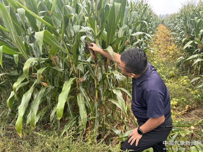 10月8日,山东省德州市禹城市气象局农业气象服务人员深入田间地头察看玉米生长情况 韩明明 摄影